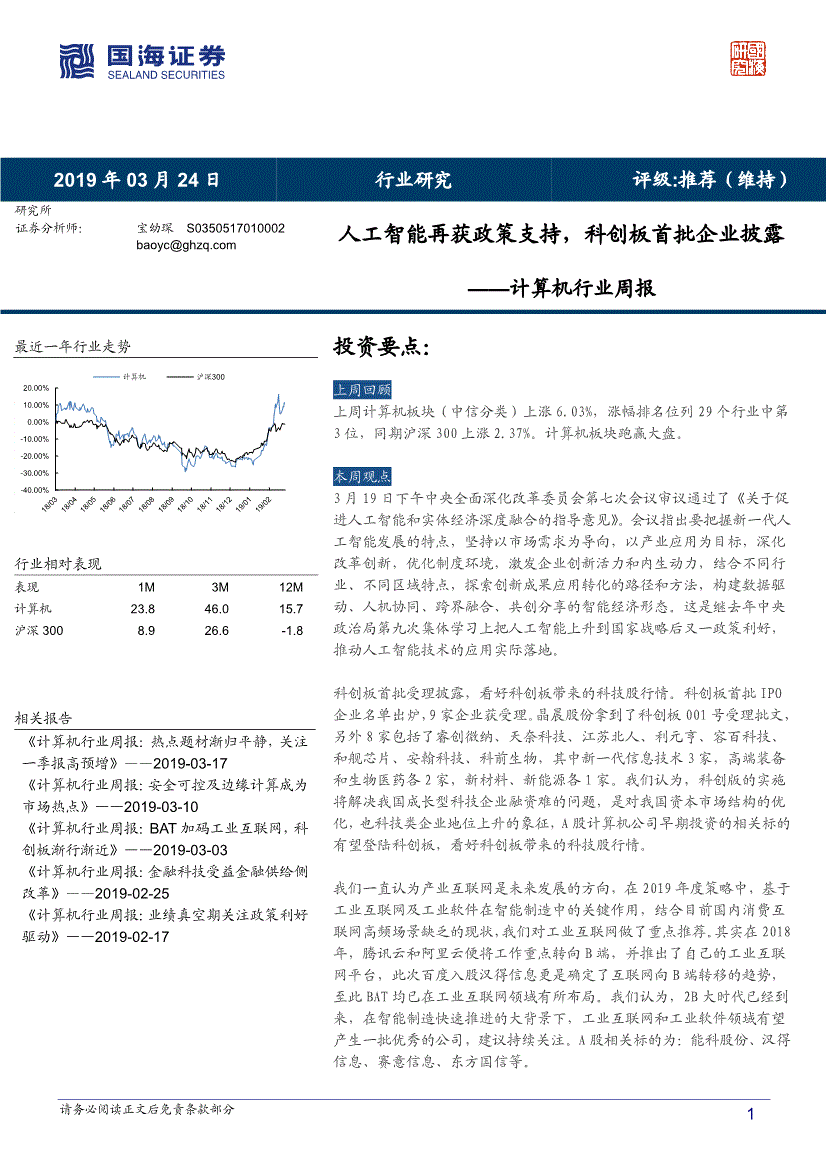 国海证券-计算机行业周报:人工智能再获政策支持科创板首批企业披露-190324